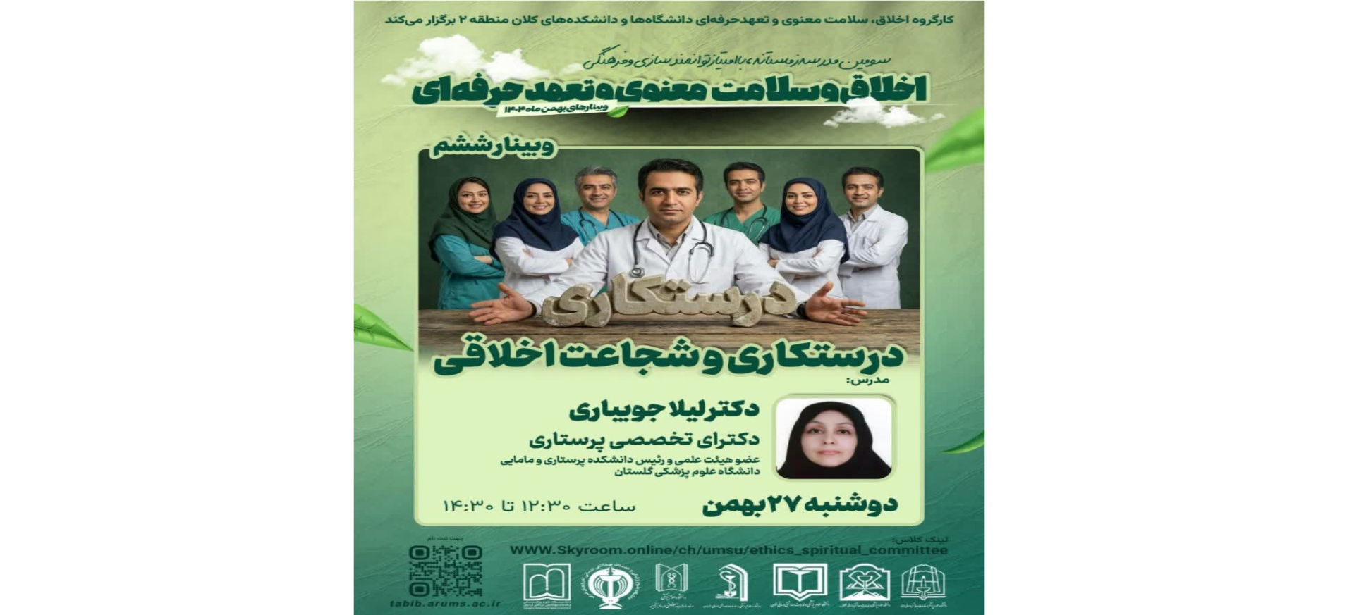 ضمن سپاس بیکران از حضور ارزشمند و تعامل باشکوه همکاران گرانمایه در وبینار های برگزار شده ،به استحضار می رساند ان شاءالله از ساعت12:30 روز دوشنبه 27 بهمن ماه با وبینار درستکاری و شجاعت اخلاقی با تدریس استاد بزرگوار سرکار خانم دکتر جویباری در خدمت همکاران و اندیشمندان جامعه پزشکی هستیم .خانم دکتر جویباری از اساتید شاخص اخلاق پزشکی و پرستاری و عضو هیأت علمی و رئیس دانشکده پرستاری و مامایی دانشگاه علوم پزشکی گلستان هستند،ایشان از اندیشمندان و صاحبنظران و تلاشگران موثر در نظام سلامت و بانیان مباحث بسیار مهم درستکاری اخلاقی هستند که در روانشناسی اخلاق و شکل گیری منش اخلاقی بسیار مهم هستند.در این وبینار تلاش بر این است تا مطالب با تامل بر مباحث نظری به صورت کاربردی ارائه شوند،امیدواریم با حضور ارزشمند اساتید فرهیخته و بزرگوار و همکاران گرانقدر وبینار موثری داشته باشیم .مجددا از همراهی ارزشمند همکاران معزز سپاسگزاریم .